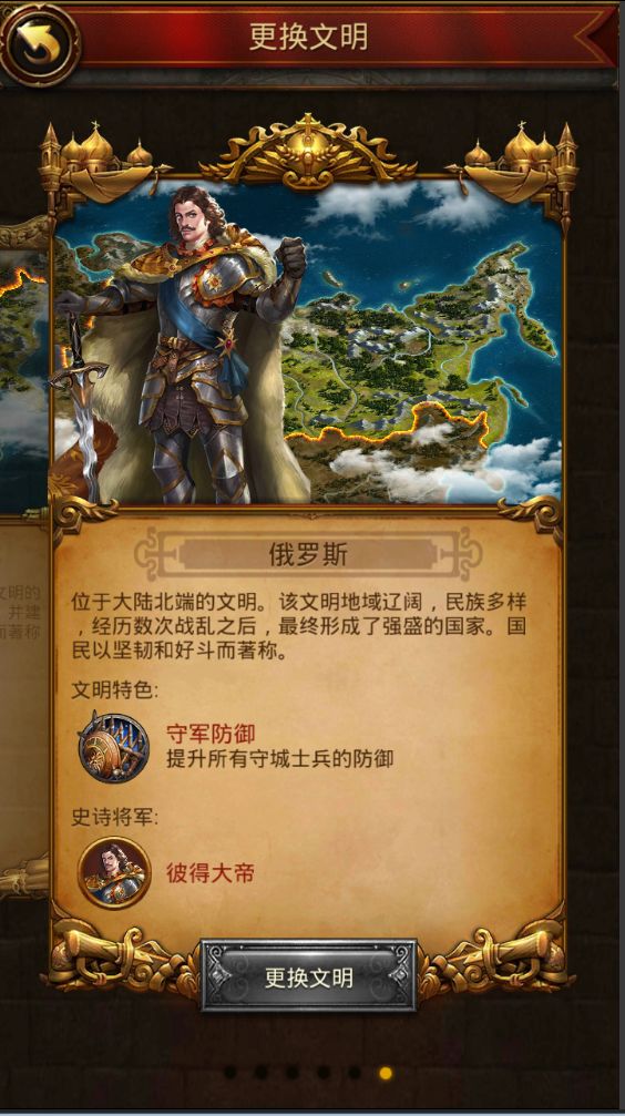 游戏中俄罗斯文明的文明特色是赠送一个守军的科技,可以提升守城士兵的防御力。代表将军则是俄罗斯最富盛名的大帝彼得。