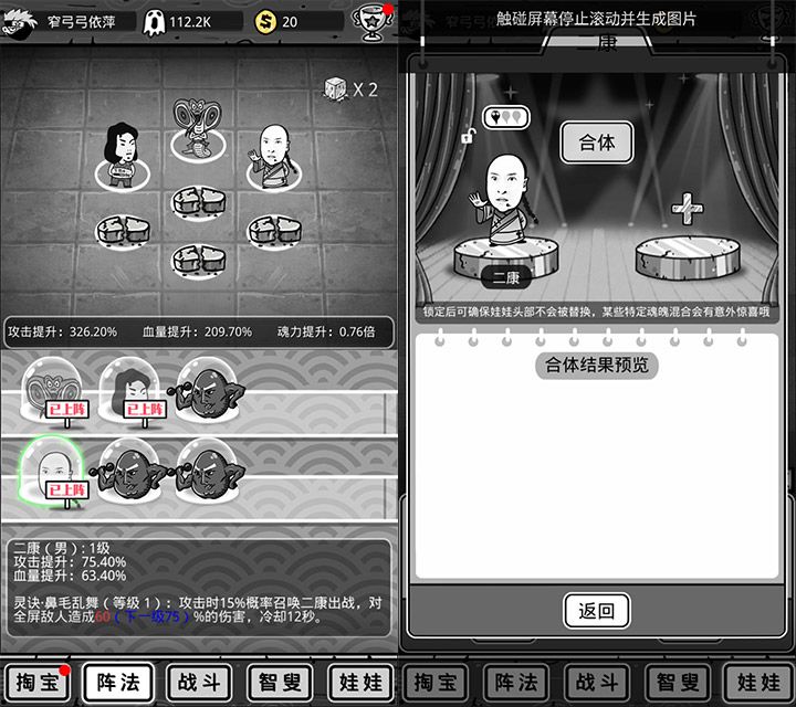 除此之外,游戏最大的一个亮点,则在于培养,他们的娃娃系统非常有可玩性,可以按照你的思路自由合体,创造出各种让人捧腹不禁的搞笑人物,而且技能以及文案搭配也很走心,绝对会让你有尝试所有的组合的冲动。