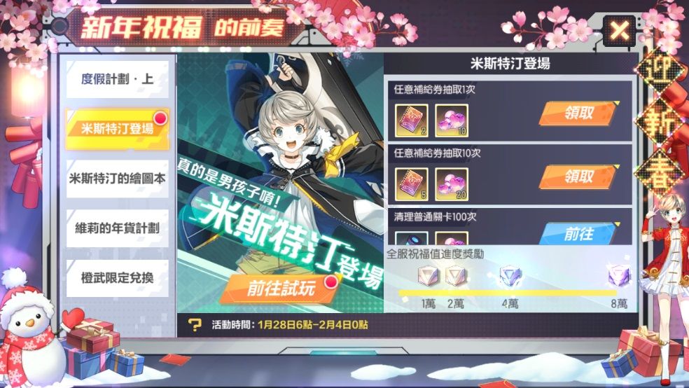 4)期間內可以使用(米斯特汀)角色試玩關卡,首次通關可獲得獎勵