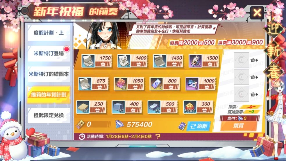 活動期間【維莉的年貨計畫】介面商店會上架各類商品,指揮官可使用超能結晶購買,當一次購買多件商品且當次消費的總價大於一定價格(例如:2000或3000以上)時,會分別出現滿減優惠折扣喔!