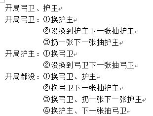 由于在螺旋风暴中存在换牌和弃牌机制,所以 弓卫+护主 开局能分为以下几种情况(只讨论全力找这两张牌):