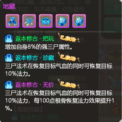 地藏套,逍遥觉得是低等级时期男鬼最舒服的套装了,在没有四阶的时候人物的控制能力还没有那么强,但是人物的抗性上限其实已经不错了,所以说上地藏套抗性上限也是完全足够的。有了地藏套之后基本上只要考虑男鬼有蓝就可以了,只要男鬼能持续性的回血那么其他小伙伴身上的蓝就有保证了。至于回血量其实完全不用担心,现在的许多闪现宝宝都是有仙风道骨的,6回合之后的绝境和妙手回春也可以大大增加队伍的补给能力。