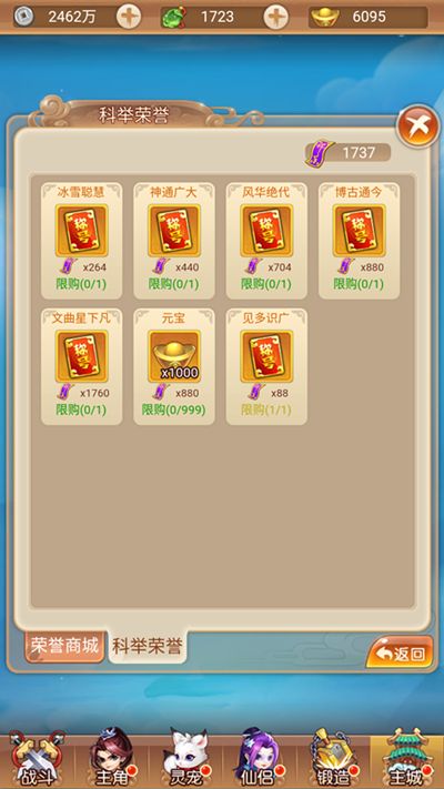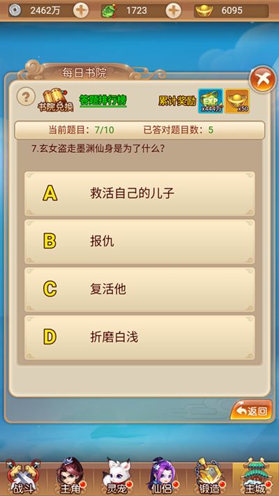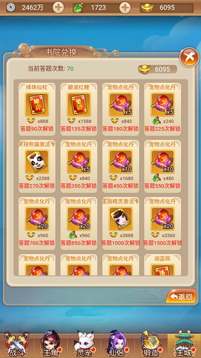 答题除了可以获得经验值、元宝这些基础奖励之外,更重要的是还可以根据答题次数解锁书院商店里的物品,包括丹药材料,甚至还有宠物激活卡!(赤裸裸的说明知识就是财富)