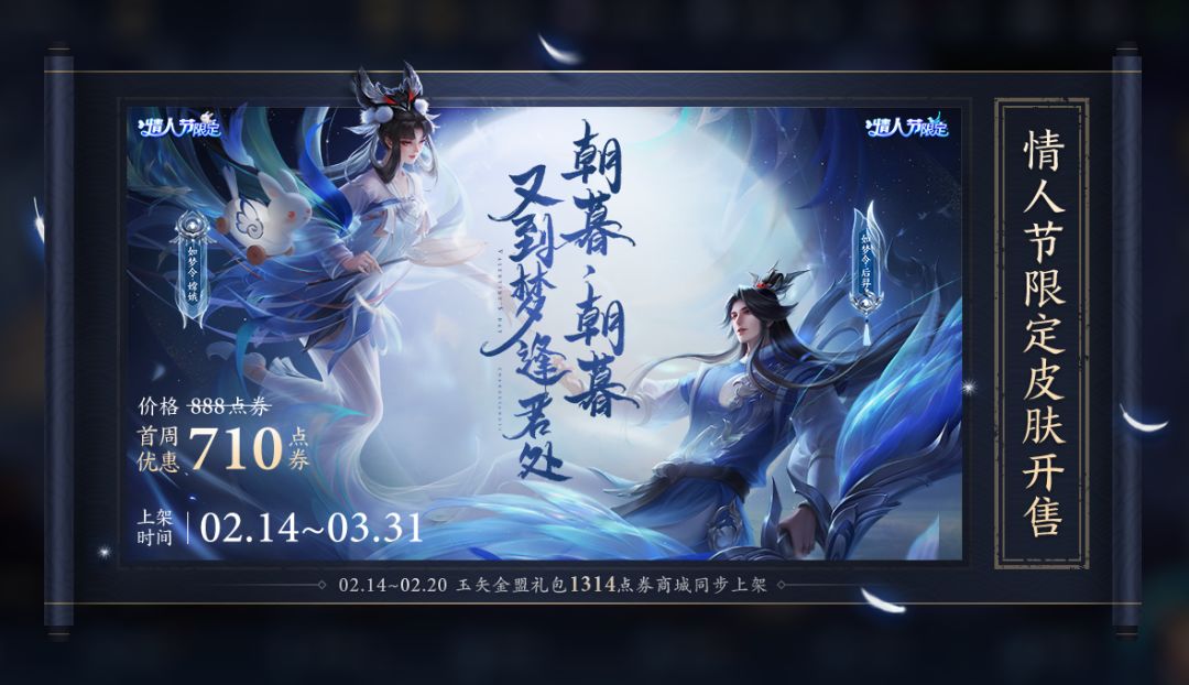 梦中邂逅,月下相逢,命定之人终成眷属!首次将汉服元素与王者的美术风格结合的情人节限定皮肤-如梦令即将上架。