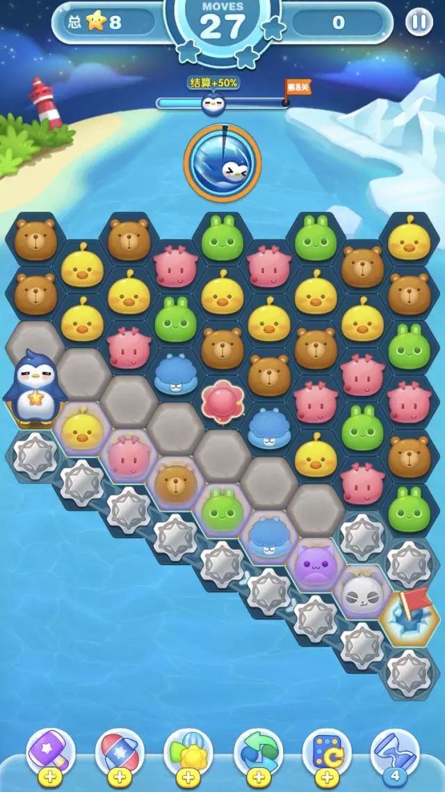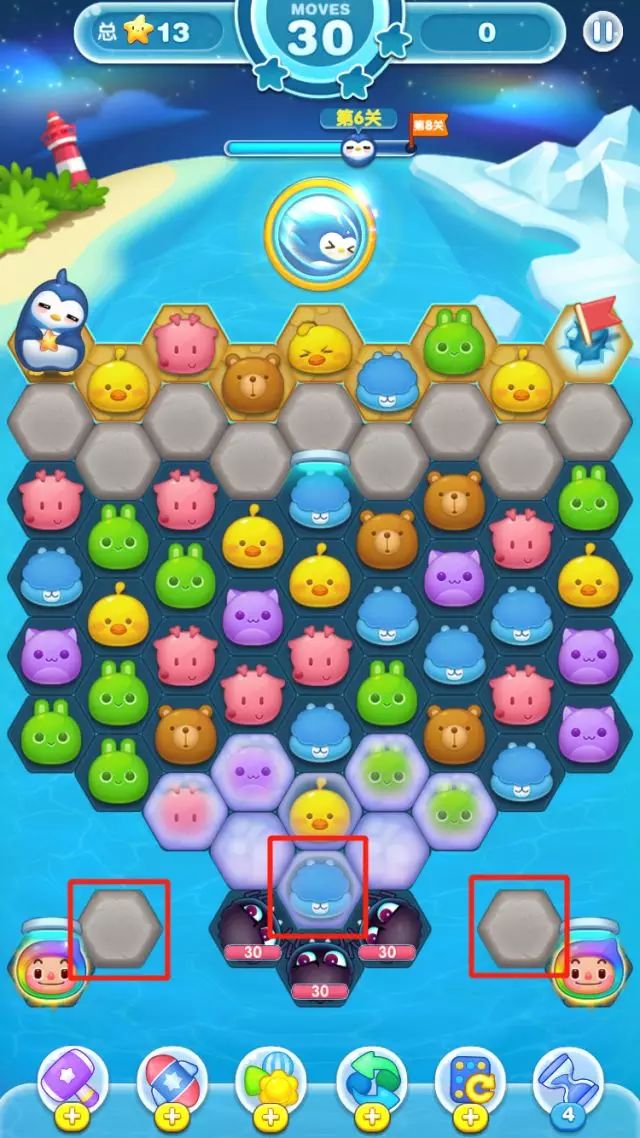但是壁垒需要大炮击破,而这里没有,所以第一排的壁垒无法消除,但是因为纪念币可以消除成普通棋子,然后你再解放糖果纸里的棋子,这才是这关考验你的难点。