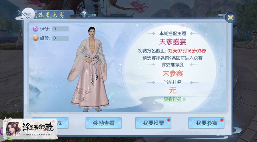 《浮生为卿歌》手游中的选美大赛分为预选赛以及总决赛两部分,在预选赛期间,系统将根据选手们的装扮积分和点赞积分的总和进行排名,装扮积分和点赞积分越高,预选赛的排名也就靠前,在排名时间截止后,前9位选手将成功晋级,进入总决赛,并开始新一轮的角逐!