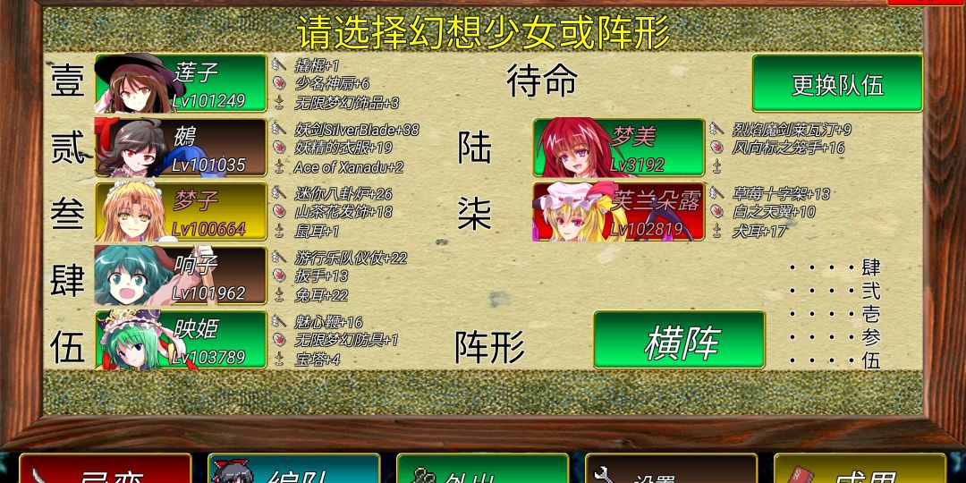 这一套主要的人物是莲子和梦子,其他的人物可以随意更换,根据对面的人物克制带人和装备,比如有反击的(如幽香)就带四季映姬,有反伤的就带防反伤防具,有停止的就带梦美,有混乱的就带紫或者带山茶花防具(可同时克制易者),莲子最好带撬棍,因为有一些狂化体带了挨打就破坏装备的防具。莲子必须一号位。