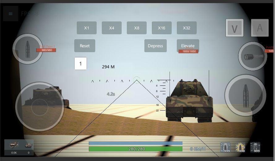 同时,改进了瞄具的视觉效果。现在瞄具不会跟随炮塔方向,而是跟随视角方向,更加方便观察敌情。也重布局了炮管上升的按钮,位于右侧方便点击。将距离的显示放在中心的偏左上角。