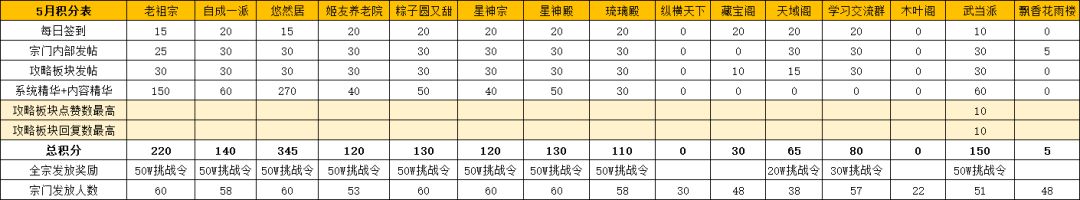 感谢大家本月的支持和参与,5月的宗门板块积分情况整理如下: