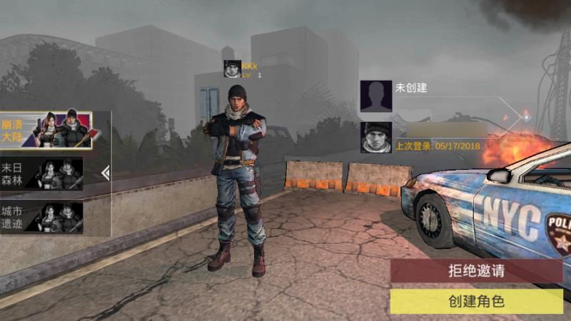 每个账号可以创建三个角色,左侧「崩溃大陆」、「末日森林」和「城市遗迹」为创建角色栏(并非服务器选择栏)。各位幸存者在创建好自己的角色后,便可以通过右下角的邀请好友按钮进行好友邀请了。