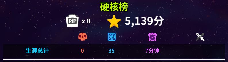 硬核模式 - 在剧情模式中到达第二世界后就会永久解锁。 此模式中主角只有一条生命,但是合成物品的素材需求量和时间都大幅度减少,而且所有合成配方也都改为由采集资源和打败敌人时随机掉落。游戏结束之后,你可以在模式专属的硬核榜里面查看你的成绩,并解锁硬核模式专属的成就。
