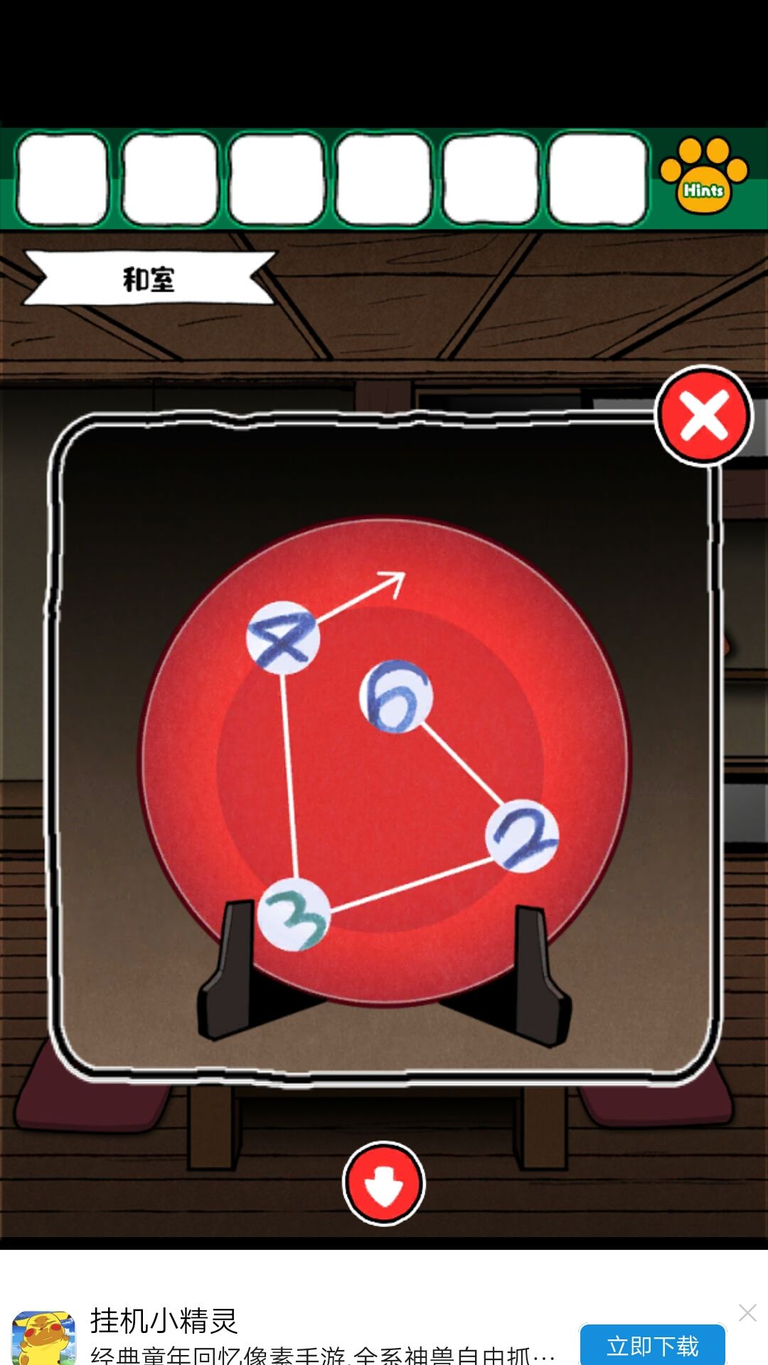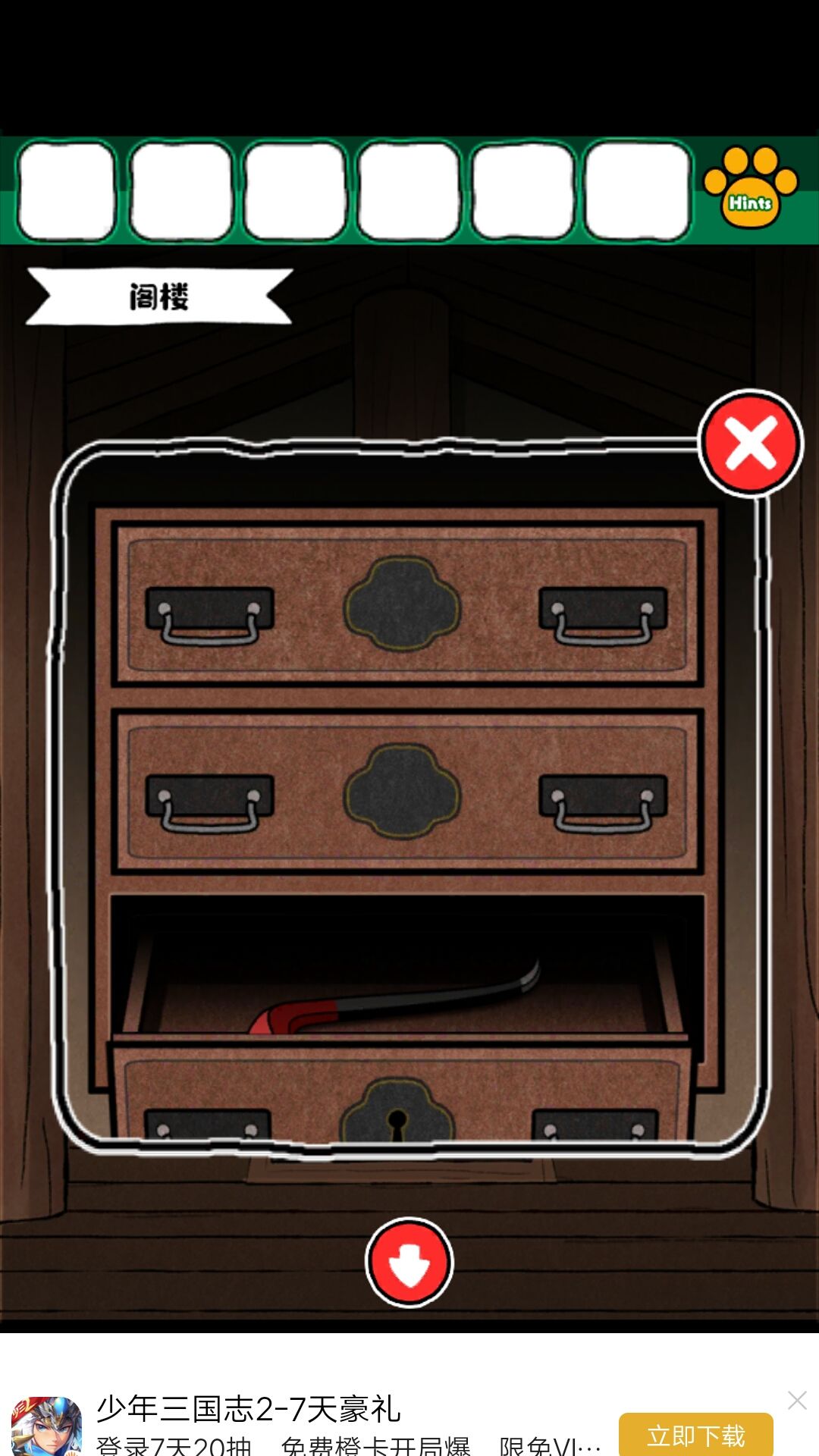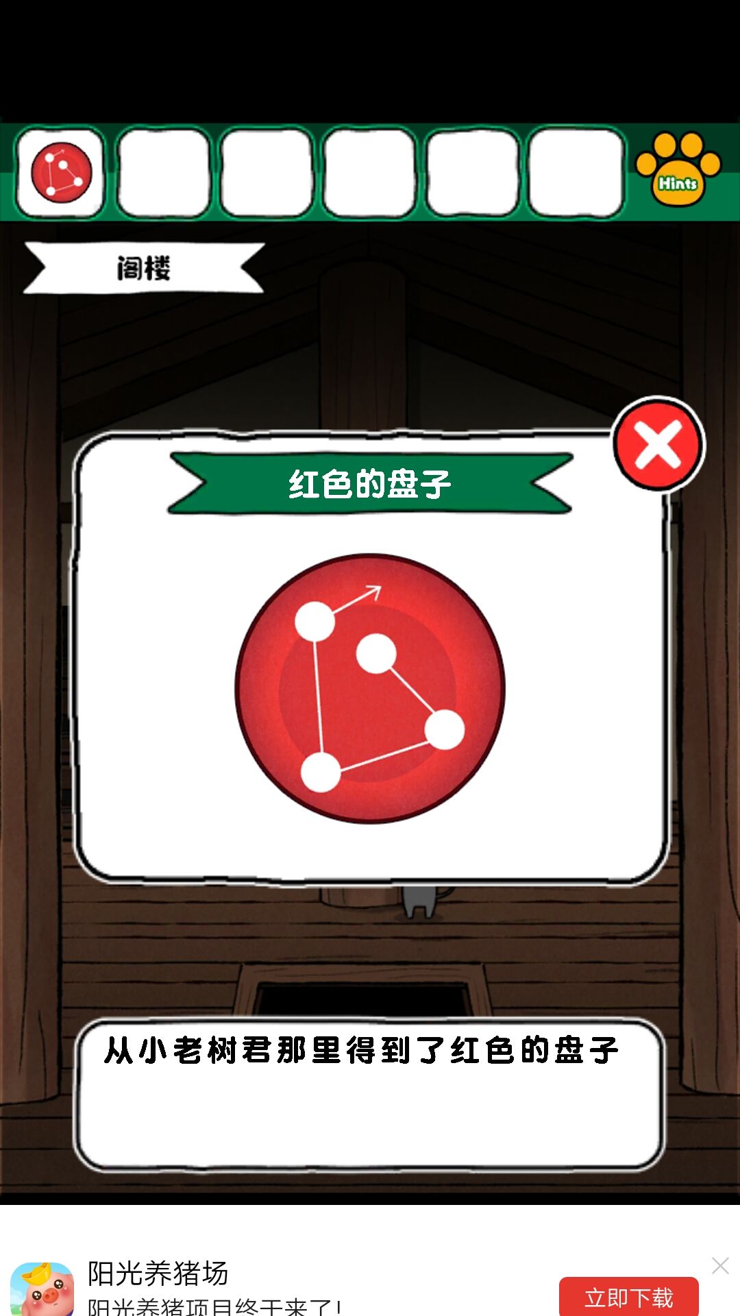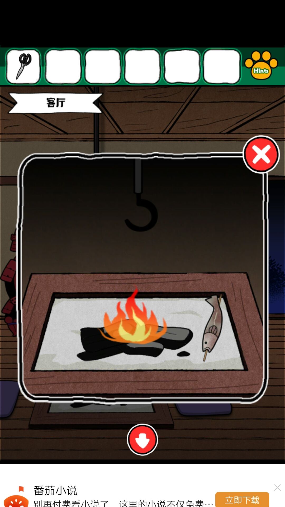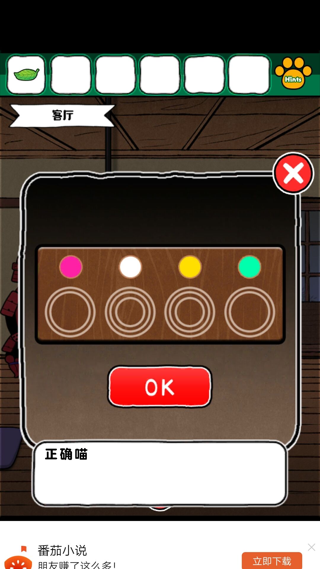 8.获得磁铁后,在客厅的洞中得到钥匙。钥匙来小老鼠的柜子,得到撬棍,撬棍打开画下边的木板,得到金币给小老鼠。得到红色盘子,给到娃娃旁边的盘子,得到密码:6234最终获得一本书