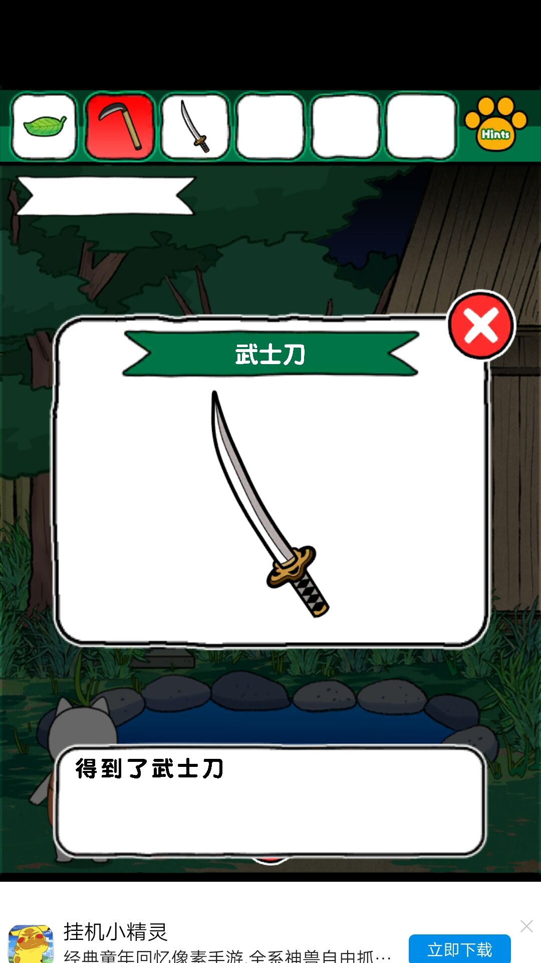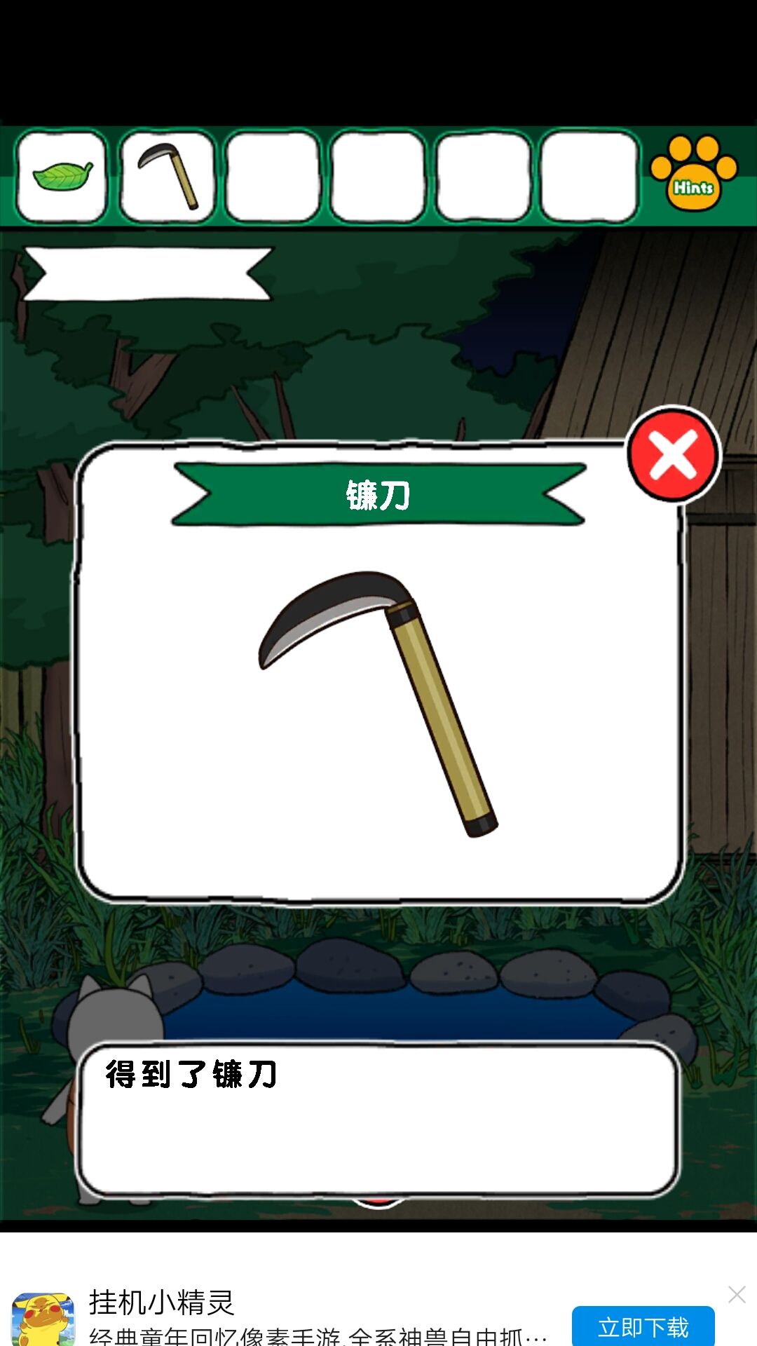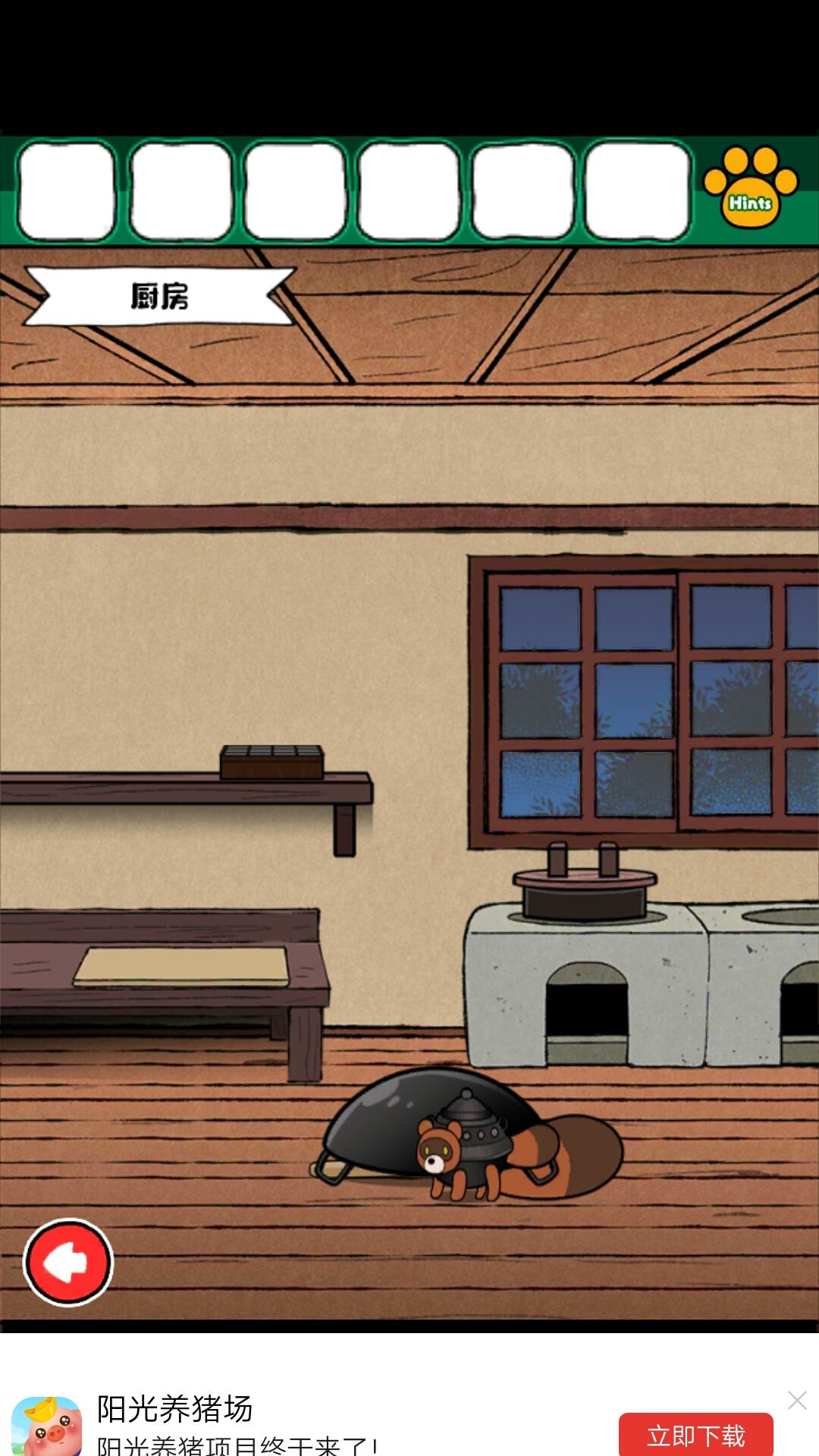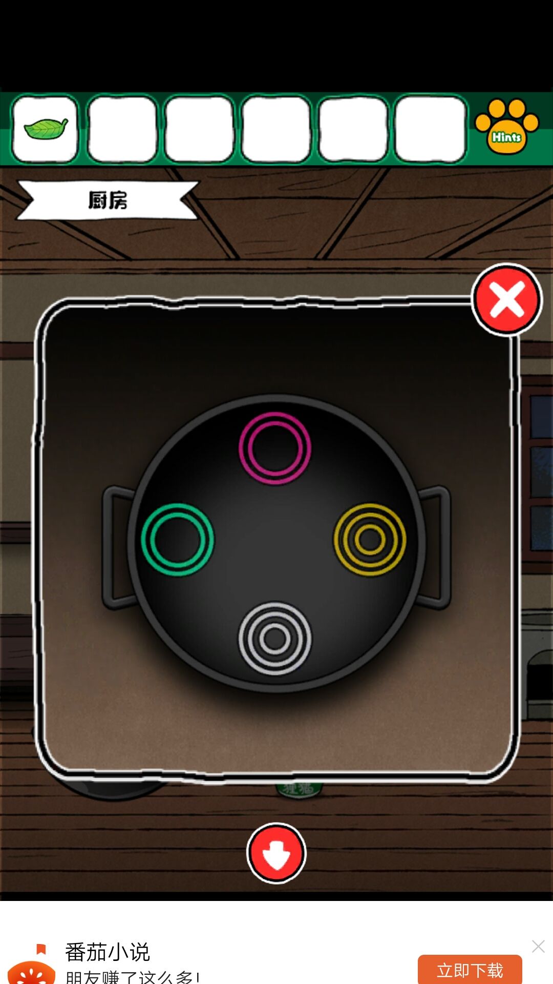 3.拿到狸猫的粮食,去厨房,把铁锅用棍子架上,放粮食,抓狸猫,拿叶子,看到锅里的颜色,为门的密码