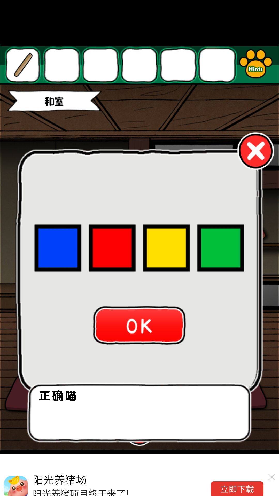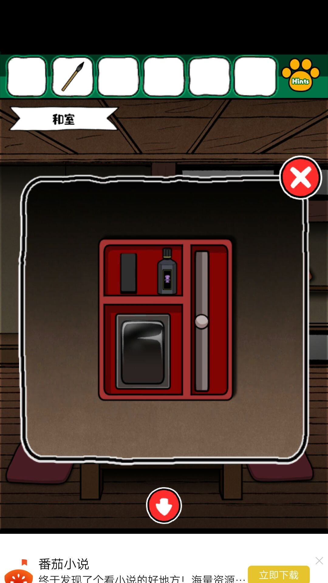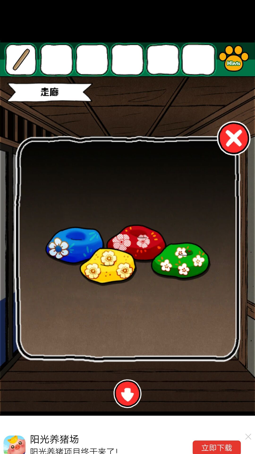 2.打开柜子后获得木棍和四个彩色花盆样子的东西看下上边的花朵数量,为和室的柜子密码