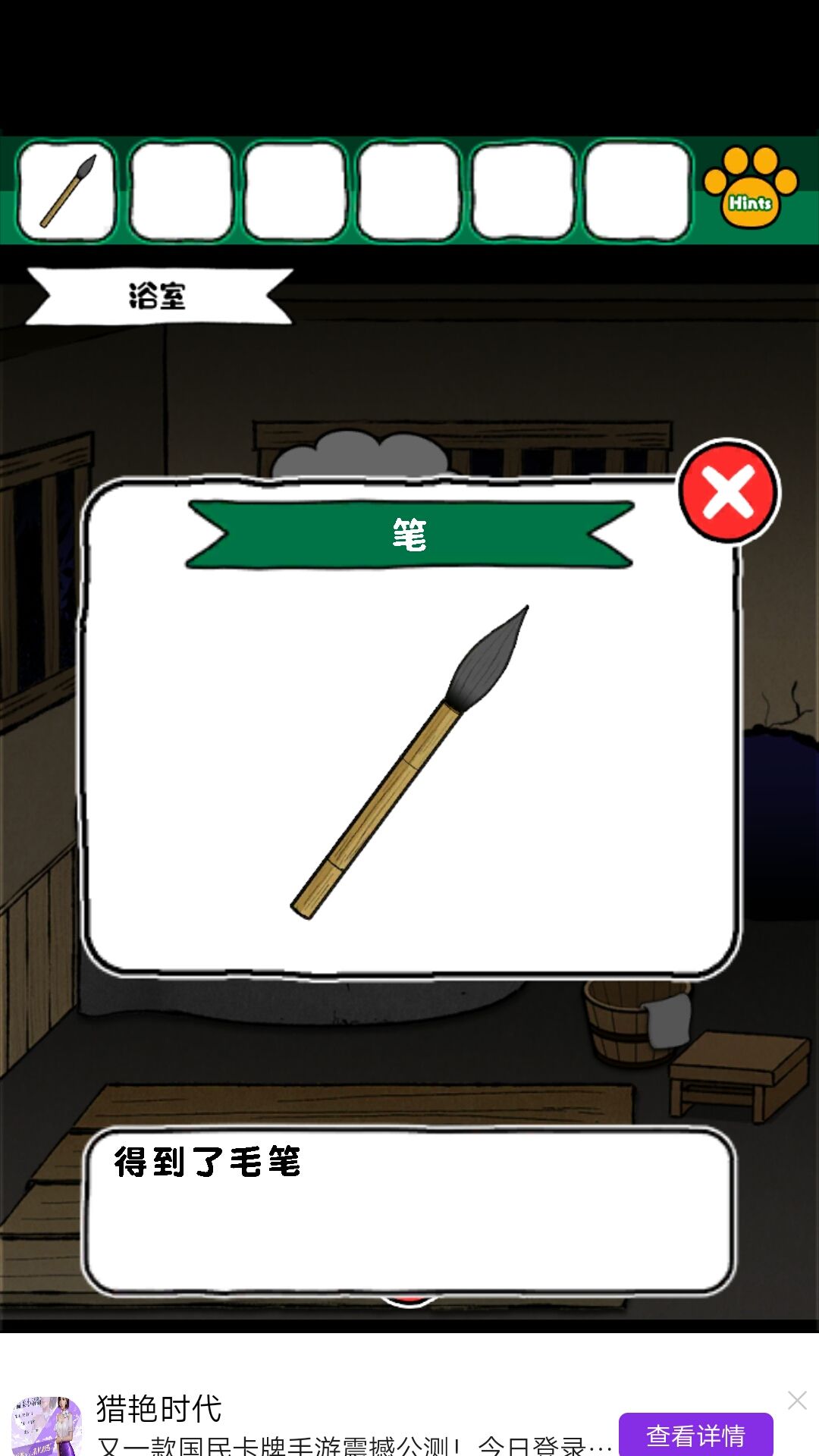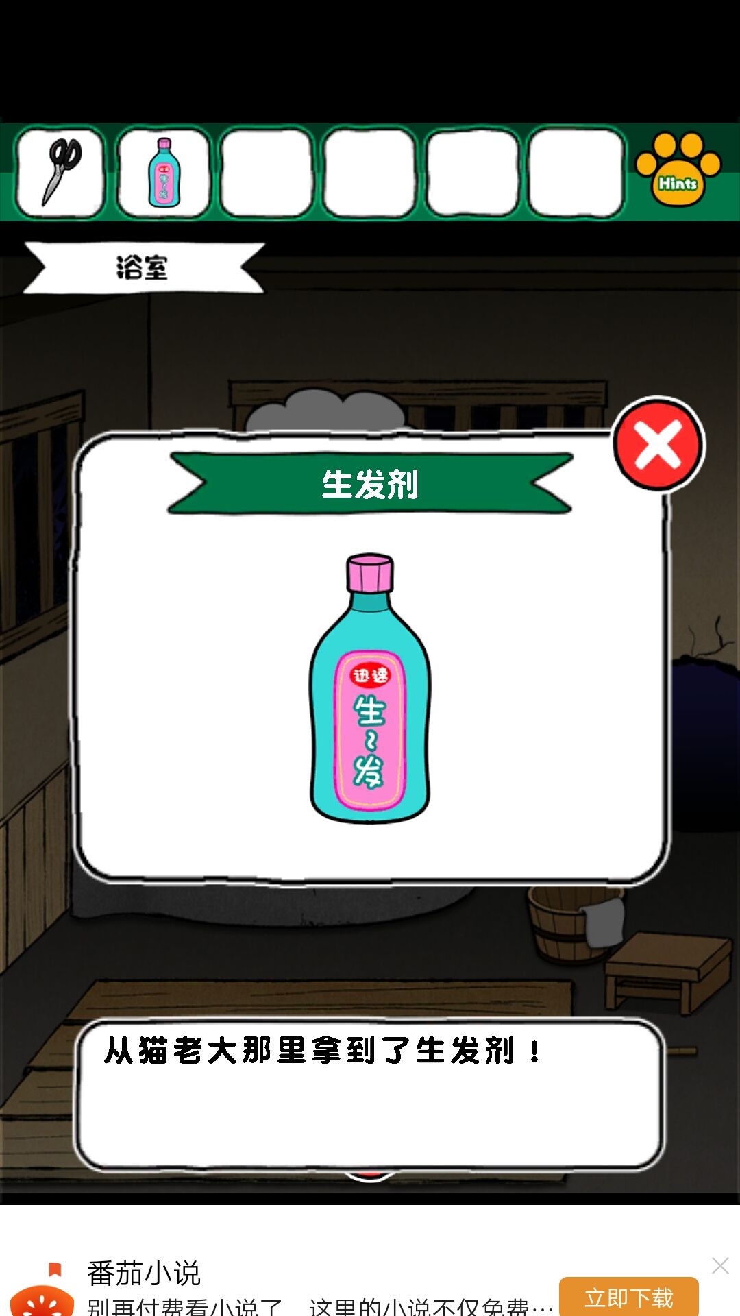 6.从大黄这里得到生发水和竹棍。生发水给娃娃,剪刀理发,得到头发,头发和竹棍组成毛笔,在墙上画画,得到龙珠。