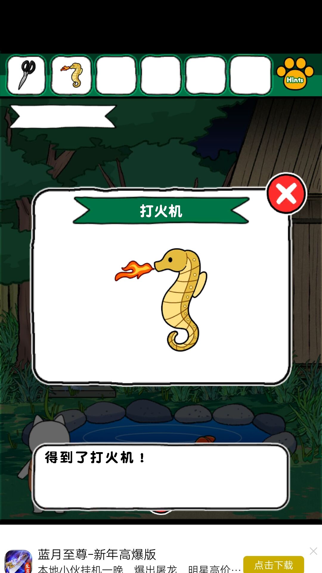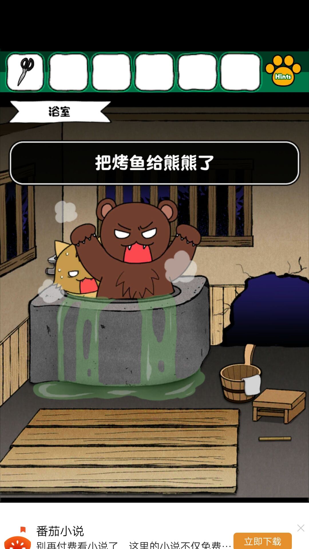 5.得到金鱼和剪刀金鱼放回石塘,拿到打火机。点燃烤鱼的火🔥,得到烤鱼,给🐻吃