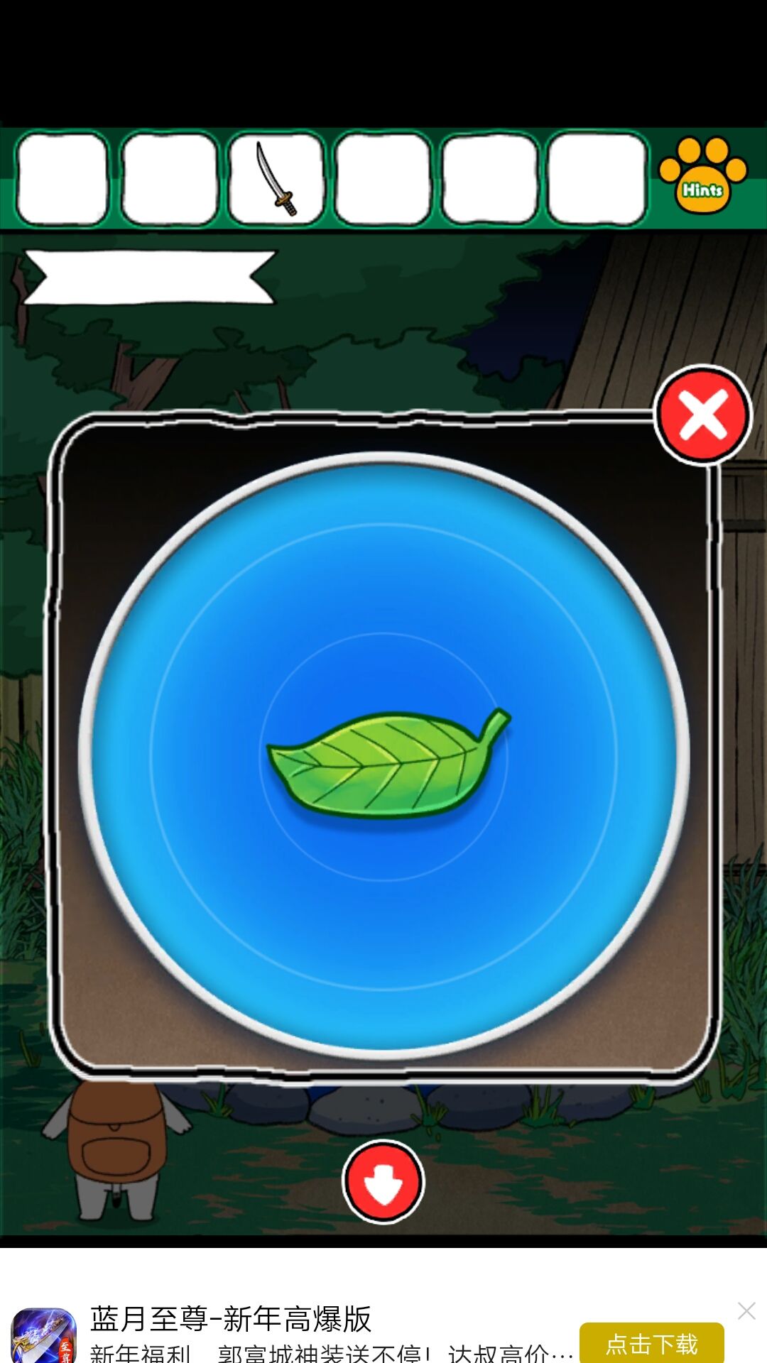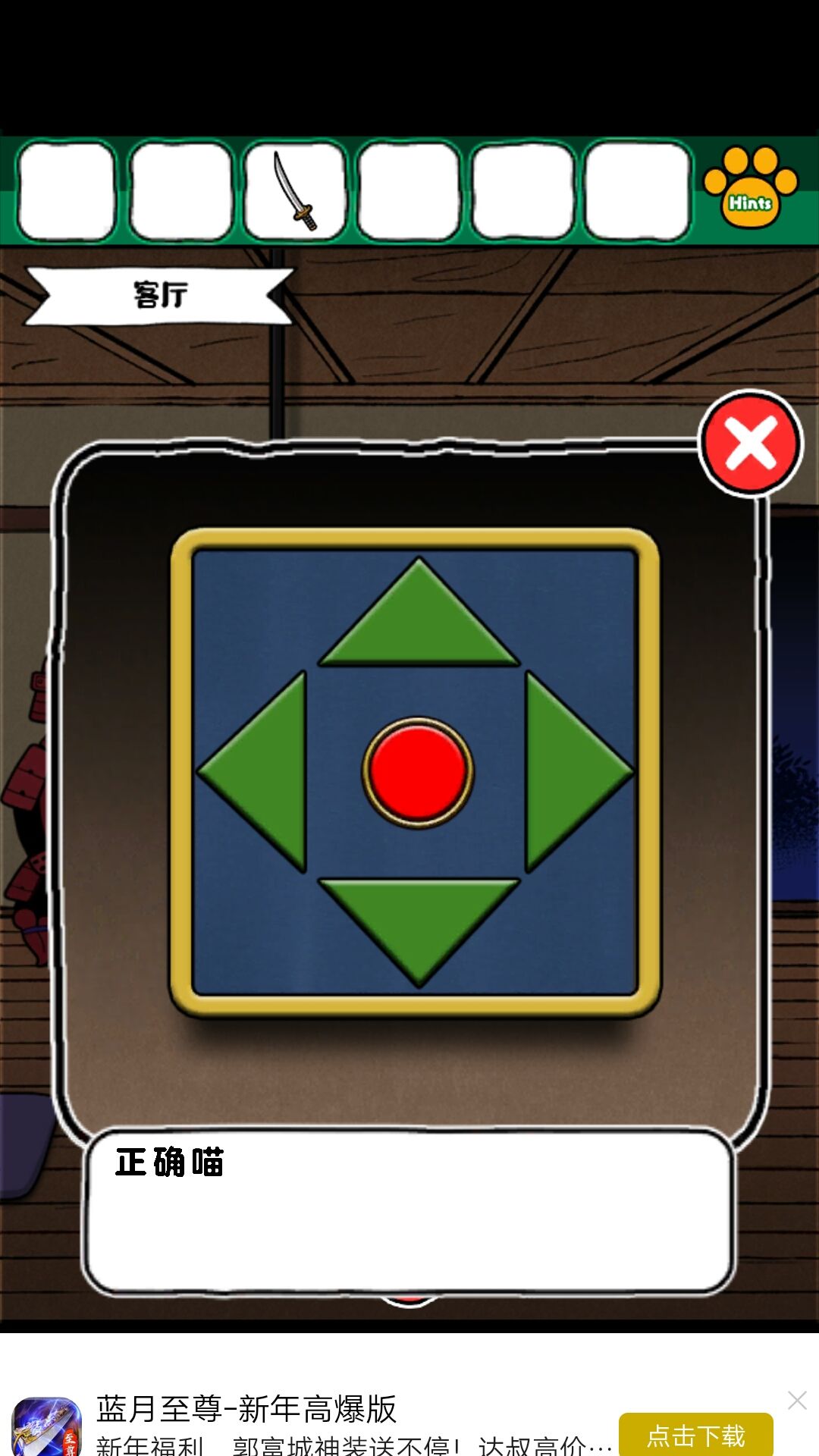 4.来到外边,拿到镰刀。割草,得到武士刀。把叶子放在佛龛的水盆上边,出现方向。方向为:上下右左武士刀给武士,得到柜子的解谜方式,为下图