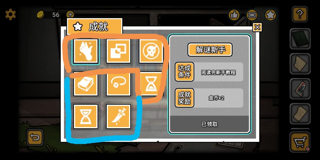 橙色区域:是大部分玩家在通关主线,但没有收集完整元素时,既第一次通关时必定获得的成就。故不详细讲解。成就获得方法见附图。