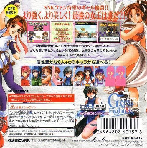 如果说上面的两部作品还算是比较“正经”的拳皇游戏,那么下面这款格斗游戏绝对让人鼠躯一震。《SNK少女格斗》是SNK在自家掌机NGP上推出的原创格斗作品,从名字不难看出,就是把SNK旗下的游戏中的人气女性角色集合出来的一款搞笑游戏。