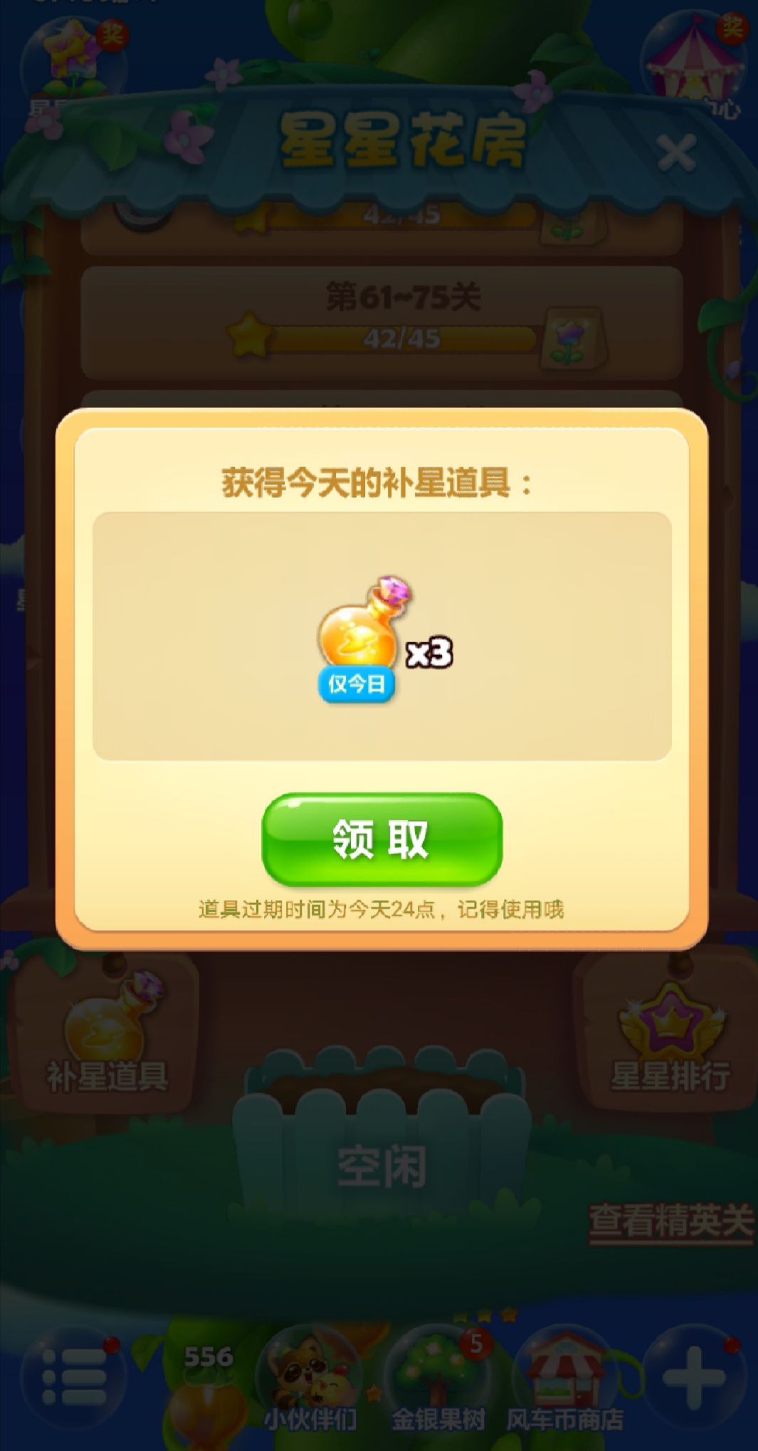 每日登录游戏时,在星星花房面板,满级玩家(主线满级即可)可领取6个补星道具,没满级玩家可领取3个补星道具~