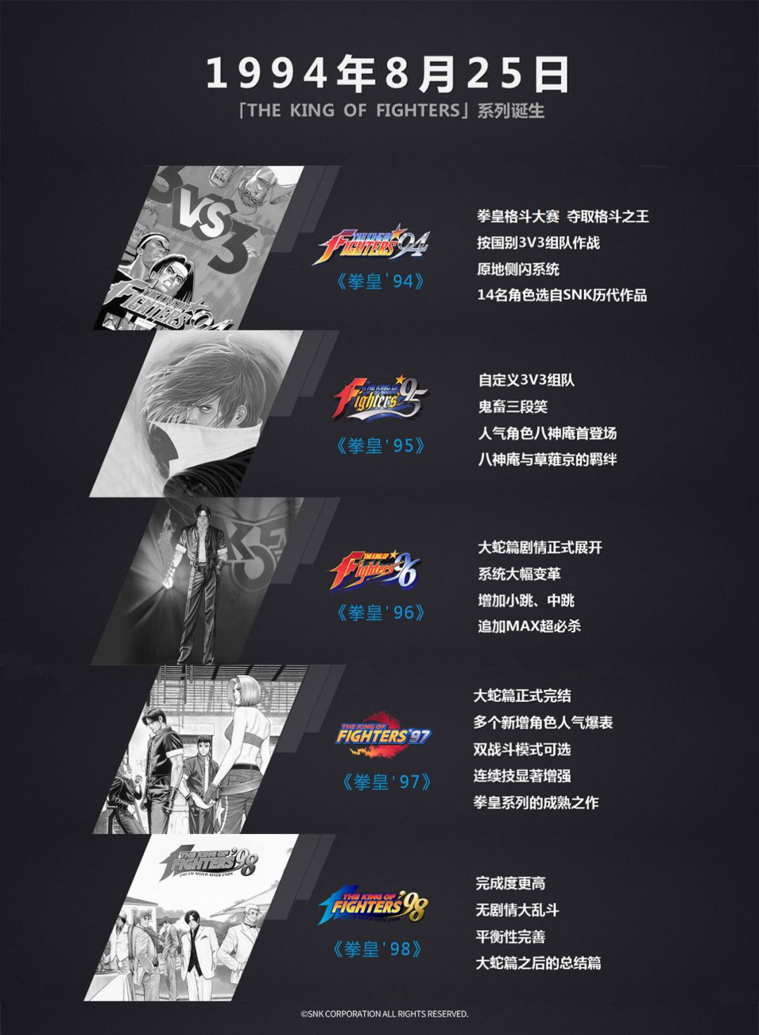 拳皇诞生至今,已走过23个年头,从初出茅庐的 ’94、’95,到超人气的KOF’97、’98,从开始变更命名方式的KOF11,到近年的KOF13、14,拳皇所凝结的对游戏的热忱始终在延续。截至目前为止,拳皇系列出品了正统篇章4篇(大蛇篇、音巢篇、阿修篇、新章),正统作品共计14部,人物角色总数200人以上。