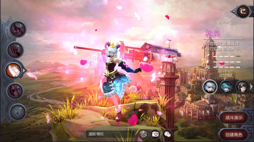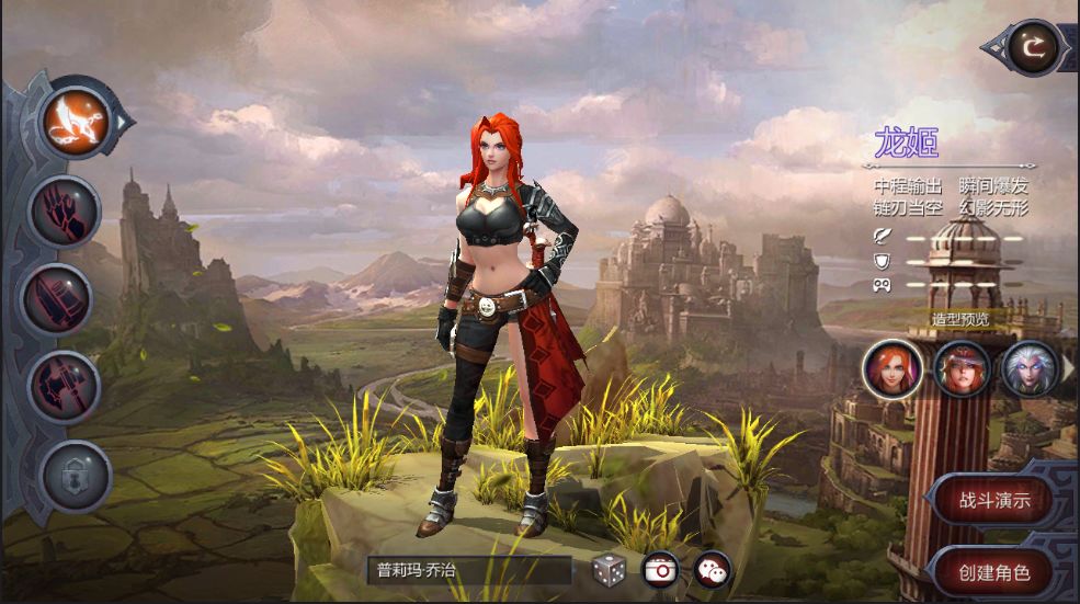 玩家在登录账号会后显示角色创建界面,在这个界面中你可以看到角色选择按键,点击后会出现选择角色的基本介绍,另外还有3个变身形态可供随意切换展示。