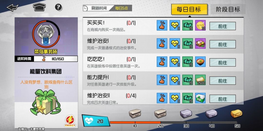 事务所目标中,除了到了一定等级的阶段目标,还有每日目标。每日目标基本是完成一些简单的固定操作,就可以获得一定量的经验,虽然单个小任务可获得的经验较小,但易得性高啊!并且可获得当日活跃度和事务所名誉度,每天积攒活跃度到一定程度,也能领取大量经验值。(哎╮(╯▽╰)╭打工的感觉更强烈了!)