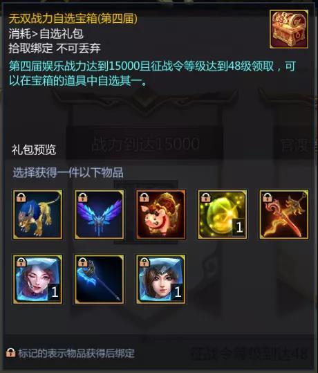 在战力奖励中获得自选宝箱中,除了第三届征战活动中包含的狂战狮王(无双/官渡)、战虎翼(无双/官渡)、珍宝猪(无双/官渡)、日月苍穹(无双/官渡),另外新增加了鬼虎劈天斧(无双/官渡)和最后一个锦衣卫系列换装【锦衣女侠】。