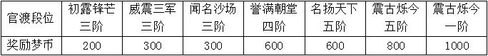 不仅仅如此,征战令赛季结束时,我们会根据本赛季(S4)娱乐战力和官渡段位发放额外的绑定梦三币奖励,只要达到相应的门槛即能获得,具体如下: