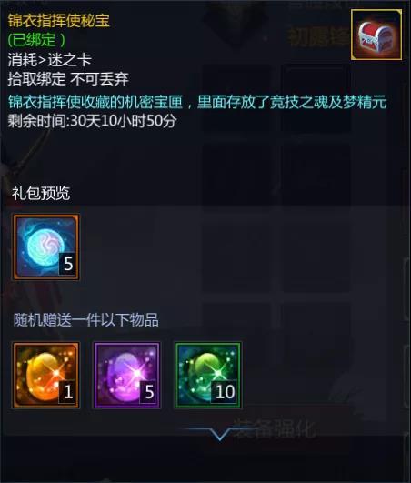 在这个秘宝中,锦衣指挥使在里面存放了竞技之魂以及梦精元供大家获取。