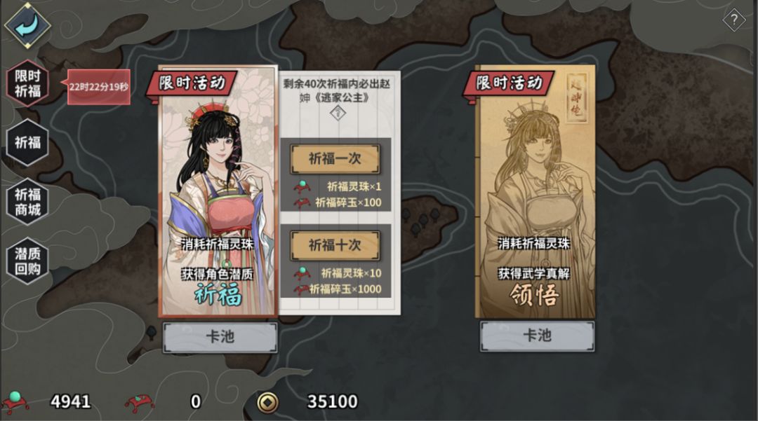 【限時潛質卡池100次保底/限時真解卡池100次保底】活動期間內,將新增另一個限時祈福卡池,限時祈福卡池內每100次祈福內必定能獲得絕潛質《逃家公主》,限時領悟卡池內每100次領悟內必定能獲得絕真解《虎貪奇刀掌》(獎勵不限次數,獲得一次後重置計數值)。注:新增聯動限時祈福,卡池不包含任何絕潛質殘頁,絕潛質只包含趙妽《逃家公主》,概率為1.5%。新增聯動限時領悟,卡池中不包含任何絕真解殘頁,絕真解只包含虎貪奇刀掌真解,概率為1.5%。