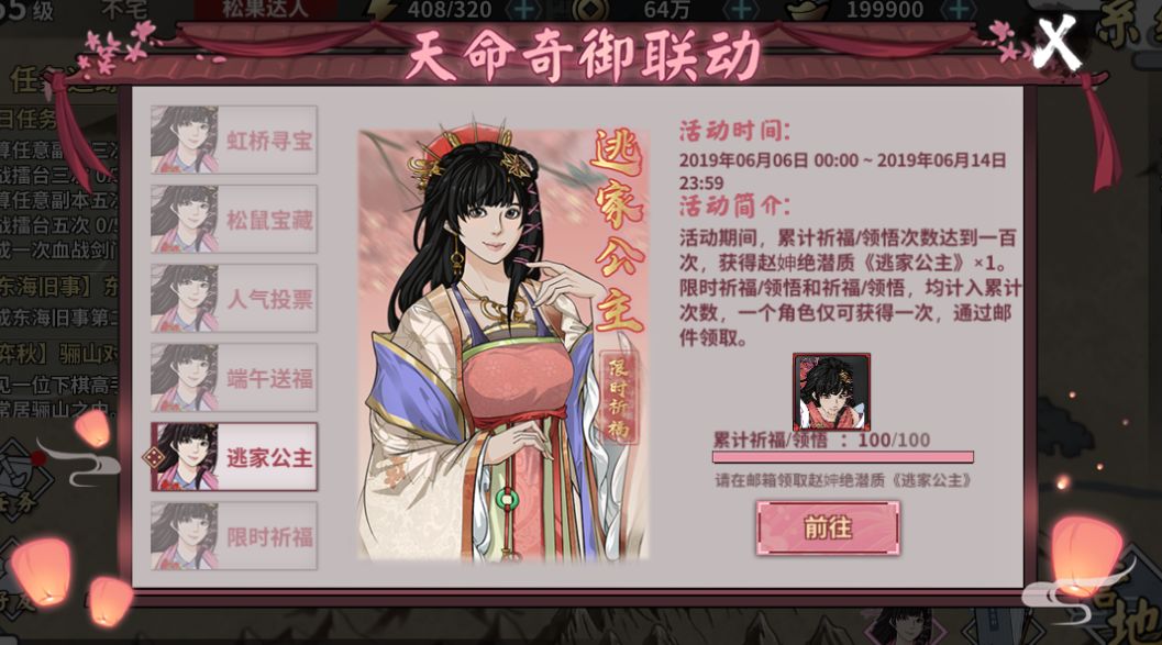 累計祈福/領悟次數,獲得趙妽絕潛質《逃家公主》×1。限時祈福/領悟和祈福/領悟,均計入累計次數,一個角色僅可獲得一次,通過郵件領取。