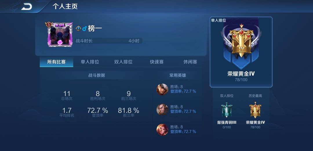 然后老样子,先说一下我的段位,我在内测的段位为荣耀王者,公测才黄金,公测那么低是因为刚出,还没打上去,且这套阵容只要不是非到极致,前三率还是高达80%了。