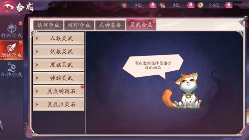 助战合成功能分4个部分:伙伴合成、魂印合成、式神装备合成、灵武合成。可产出契兽装备、妖灵装备、多属性魂印、式神装备、多种灵武、灵武铸造石等道具。