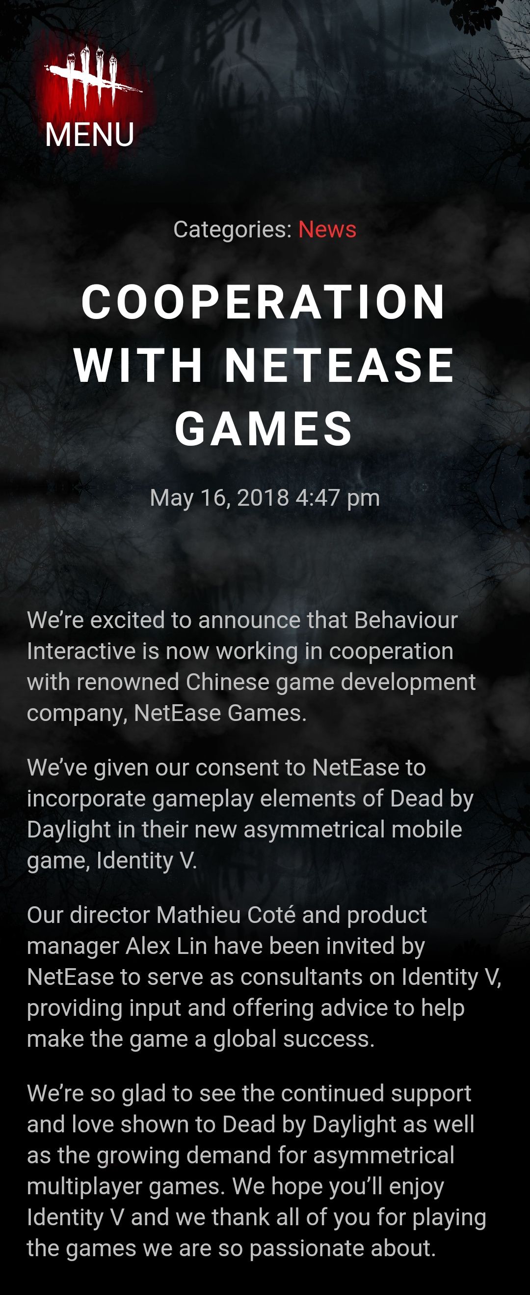 2018年5月16日下午4点47分,《黎明杀机》开发商Behavior Interactive在游戏官网上正式宣布与网易达成合作,以下为公告原文。