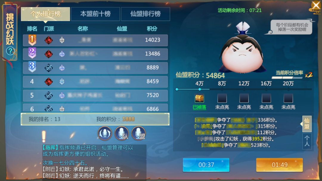 我们可以在仙盟活动挑战幻妖中挑战包子脸的紫英幻妖获得积分,或者从其他玩家那里抢夺积分,积分越高,奖励也就越丰厚~