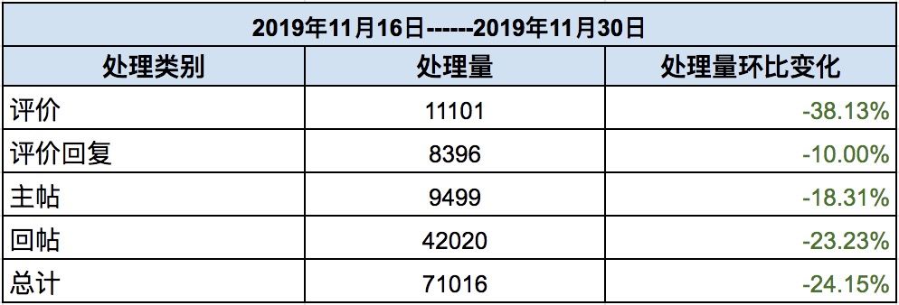 十一月下半月内容处理量为71016条,平均每日处理内容4734.4条,本期内容处理量减少约四分之一,小管家希望小伙伴们平时交流能更为和谐友善。