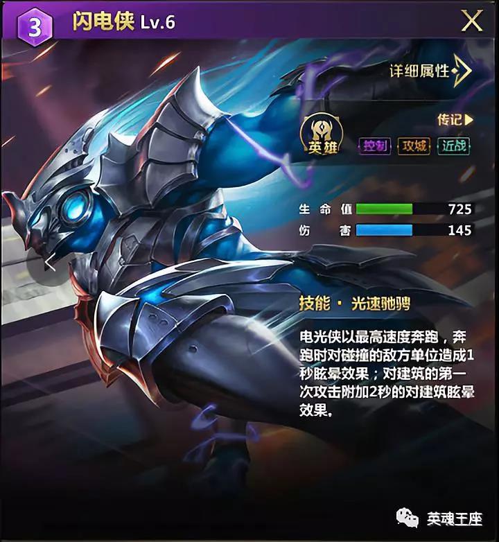 NO.4电光侠——攻城单位,在落地的一瞬间快速的奔跑,对遇到的所有敌方单位造成一秒眩晕,对遇到的第一个建筑造成俩秒眩晕。