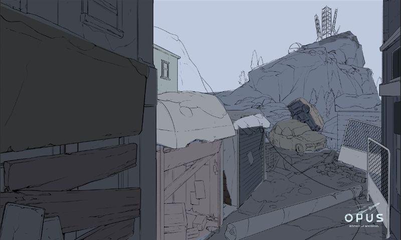 《OPUS: 灵魂之桥》的场景,希望营造「大地一片荒凉,有着事发后溷乱的痕迹」的感觉。因此在美术设计上,我们降低了画面的饱和度,让它接近黑白,带出感伤,尽可能远离童话故事般的浪漫美好。另外,我们参考真实冰天雪地的光影,因此马可夫小镇没什麽阳光、佈满阴天常见的散射光,加上暴风雪侵袭,整个小镇笼罩在一股不安的惶恐中,犹如约翰灰暗难以看透的心情。