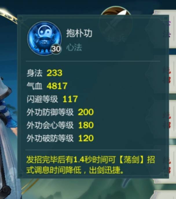 抱朴功:洛风的心法抱朴功十分完美,增加的属性分别是身法,气血,闪避,外功破防,外会,外防,除了闪避略鸡肋外,其他属性不管是PVP还是PVE都非常实用,所以很有必要打一个一代宗师特性来提升。