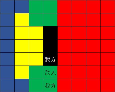 上图左边表示我方棋格,右边红色是敌方区域,文字表示卡牌。