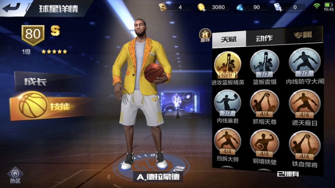 10级防守篮板,金色盖帽,篮板看似好其实是靠金色技能撑起来的。盖帽很舒服,但不像庄神,白边没有自主进攻,但是他有一手小中投打对面措手不及,是内线大闸,作为防守定点,抓帽还行。有金色称号。(打钻星不吃亏)也是怕拉开,也怕被断。推荐加:盖帽,防守,篮板。打辅助。