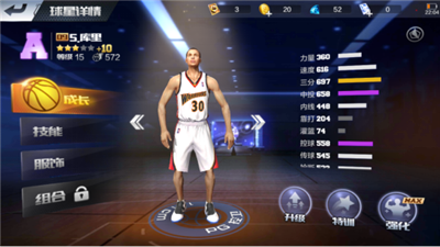 库里:刚刚注册游戏的时候可以进行新手球星3选1,库里便是个不错的选择。A级球星里面除了库里还没有谁能够强化+10之后三分属性接近700,而这高达700的三分属性也注定了库里需要在比赛中帮助己方队伍疯狂砍分。库里内线并不占多少优势,所以尽可能多的在外线游走等待队友传球,这样做有两个好处,如果对方分出一人来防守库里,内线进攻的队友可以分担一些压力,如果无人防守,队友将篮球甩给库里便可以利用空位投篮轻松投中三分。