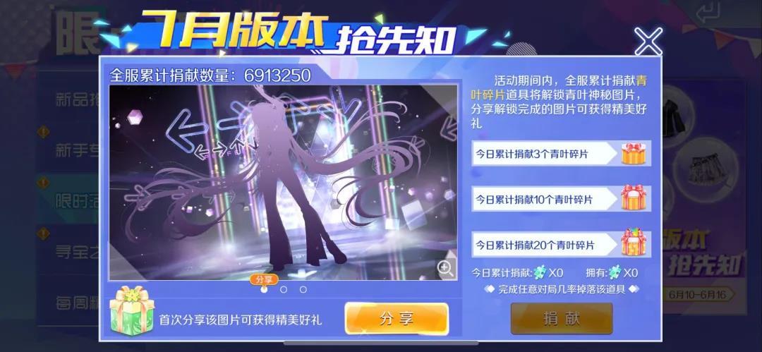 6月10日-6月16日期间,全服累计捐献青叶碎片道具将解锁青叶神秘图片,分享解锁完成的图片可获得神秘精美好礼~