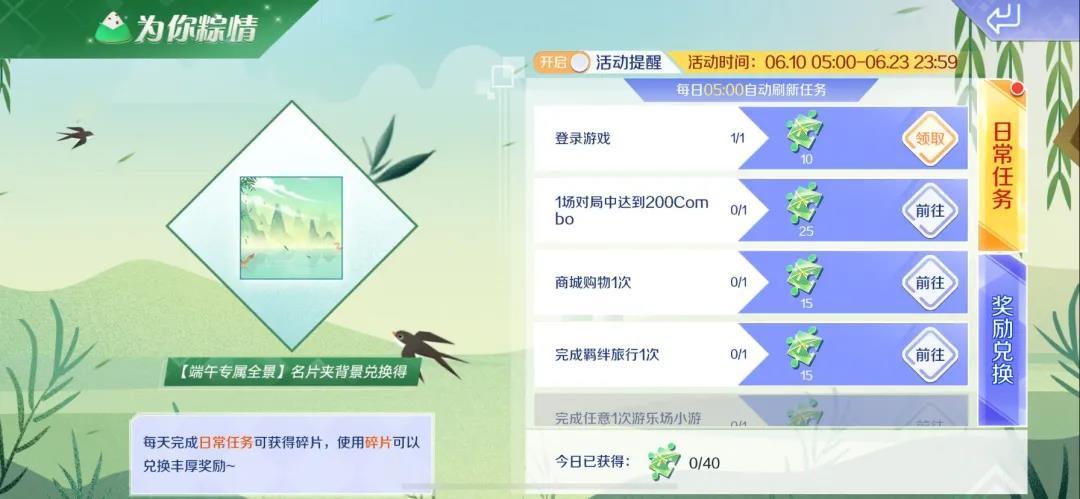 6月10日-6月23日期间,舞者们每天完成日常任务可获得碎片,使用碎片可以兑换丰厚奖励——端午节专属全景名片夹背景!
