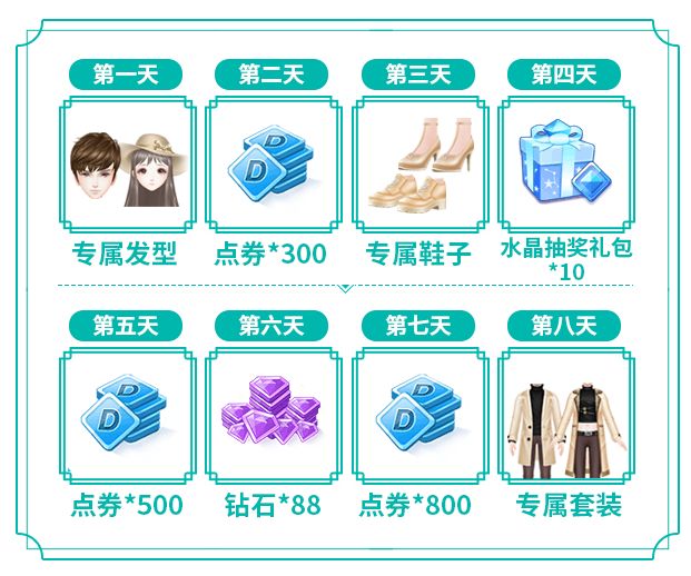 6月13日-7月3日期间,连续登录游戏合计可以领取钻石*88、点券*1600、水晶抽奖礼包*10、皮革风衣组合装的四重登录福利!
