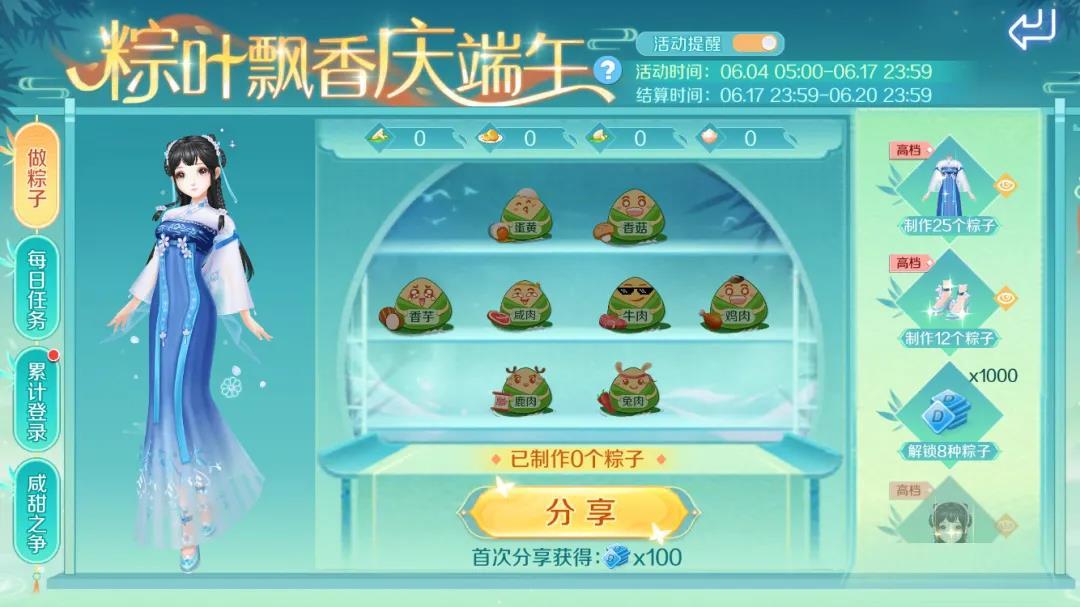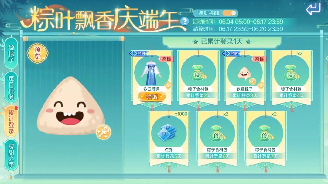 截止至6月17日,制作以及解锁不同种类的粽子,可获得丰厚的端午节活动限定好礼!活动奖励结算时间为6月17日23:59-6月20日23:59期间~