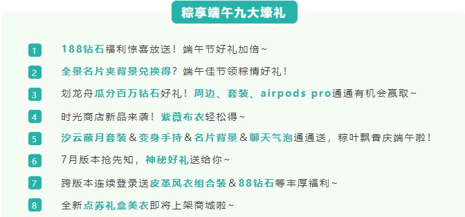 悄咪咪告诉舞者宝宝们:这次端午节不但有好吃好玩的咸甜大战、龙舟大赛,还能抱走满满一箩筐的钻石、美衣、名片背景福利!具体都有哪些免费好物呢?快往下看师兄划的重点~