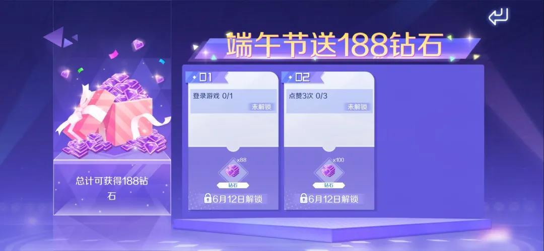 6月12日-6月14日(端午节)期间,登录游戏即可领取88钻石,点赞3次还可领取100钻石,总共可获得188钻石!