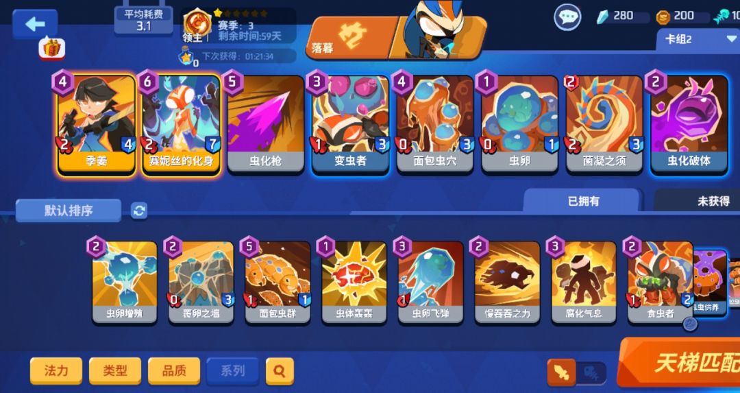 这套打法的思路就是铺场,打战技狮手上优先拿血触手和虫巢,在手牌刷出季姜后远离一定距离放下虫巢,注意放下虫巢的位置不要靠近在一起,角色放下虫巢的时候对面离你很近的话就你就回头给他砍,远离虫巢,他选择砍你的化就放不了你铺场,砍虫巢的话你就趁机拉开距离等季姜,这时候基本快到6费,直接下化身,之后复而反之,因为场上大量的面包虫让对面不得不吧用来对付你的牌用来清场,铺场同时记得于对手拉开距离,对面要硬冲脸的话,就下血触手和虫化者进行换血,虫化枪拿到就可以撕掉防卡手